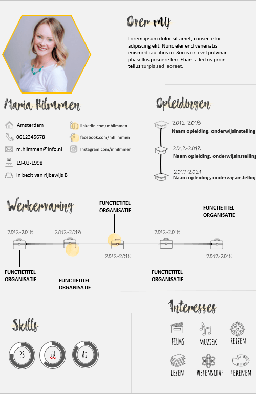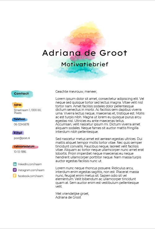 - Met dit frisse en kleurrijke cv spring jij direct in het oog! De felle kleuren en speelse iconen zorgen ervoor dat je niet snel vergeten wordt.
