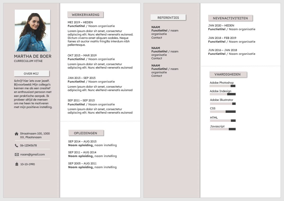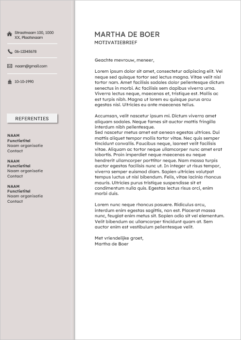 Direct na betaling ontvang je per e-mail een downloadlink waarmee je het cv-template (vaak keuze uit 1 of 2 pagina’s) en het bijbehorende template voor een motivatiebrief kunt downloaden. Daarnaast ontvangt je een handig stappenplan die je helpt om het template in te vullen.
